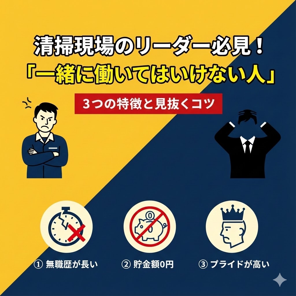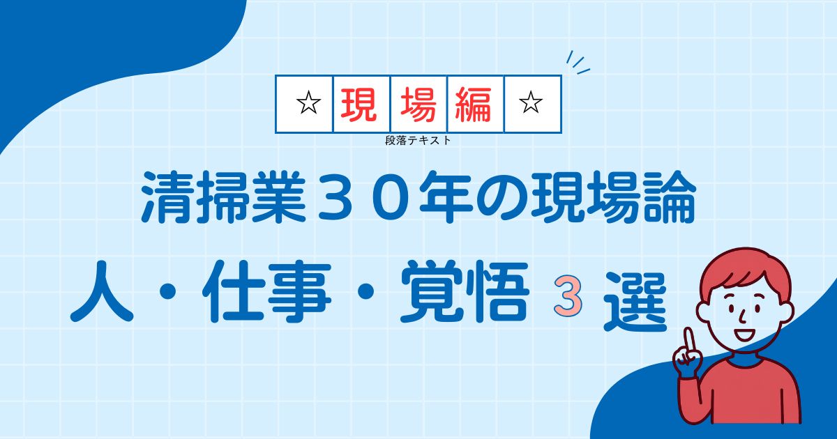 お知らせ! 2026.01.31 プロが教える「リンレイ」の凄さ。ウルトラハードクリーナー防カビプラスを私が一択にする理由 2026.01.30 「現場の王様」が会社を滅ぼす —— 清掃業界のリーダーに「人が使えない人」が多いのはなぜ? 2026.01.29 50代からの人生を豊かにする「引き算」と「基本」。私が救われた厳選本3冊 2026.01.25 【清掃業界の謎】清掃現場の真の主役。「一日を使い切る」という最強の物差しを持つ男たち 2026.01.22 「今回が最後」を繰り返す彼らと、私の葛藤。清掃業の現場で40・50代の「現実」に向き合う Twitter Share Pocket Hatena LINE URLコピー