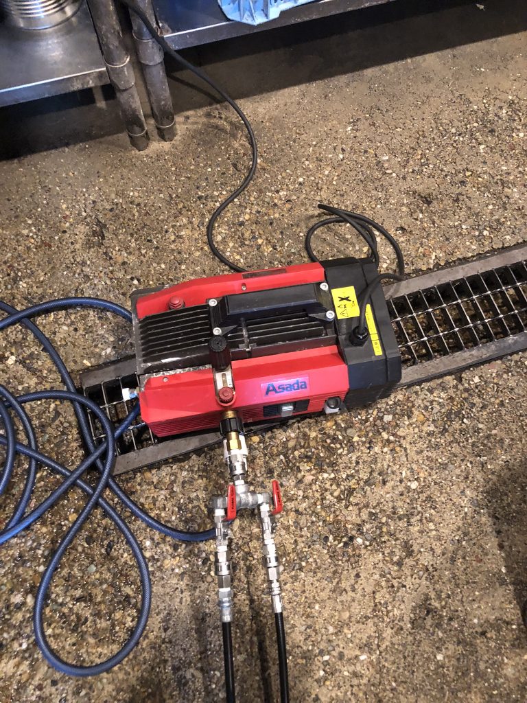 実はこのアサダ、私は現場で**「2マタ」**にして使っています。 通常、洗浄機を2分岐させると水圧がガタ落ちして使い物にならないことが多いのですが、アサダのパワーは別格です。