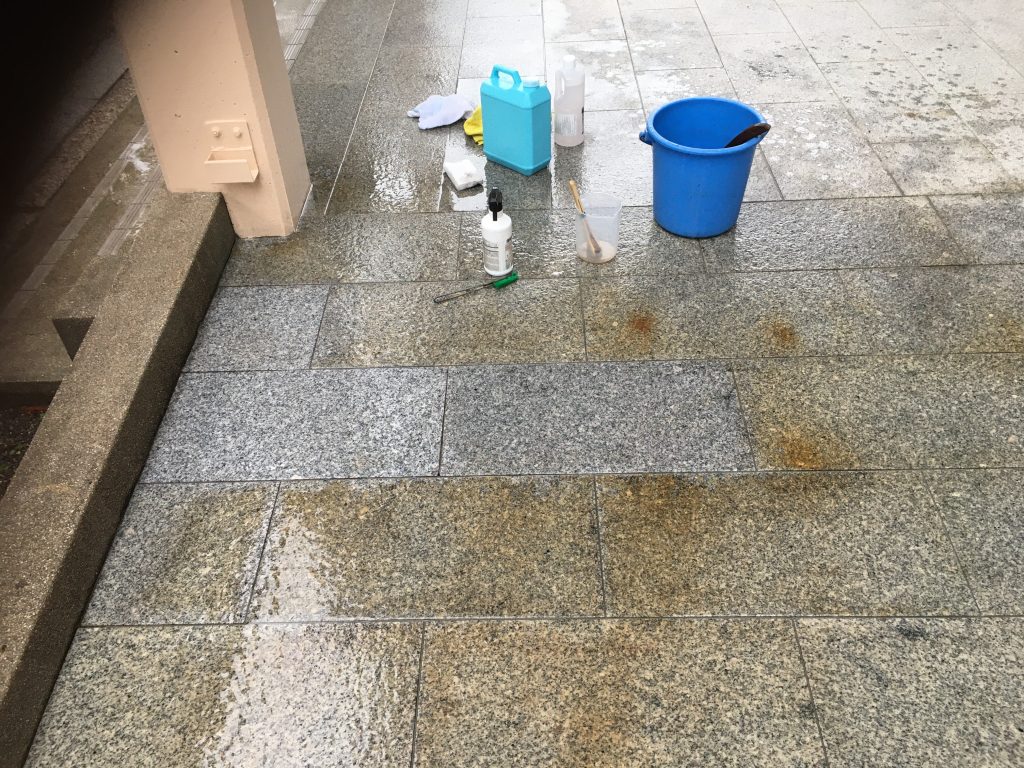 ![IMG_2655.jpg] ▲今回の現場。雨がかりの御影石タイルに、点々と茶色のサビ汚れが発生しています。